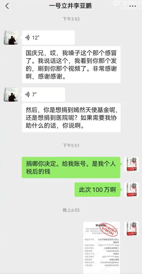 当当创始人李国庆已向李亚鹏捐款100万元,晒出银行转账和聊天截图