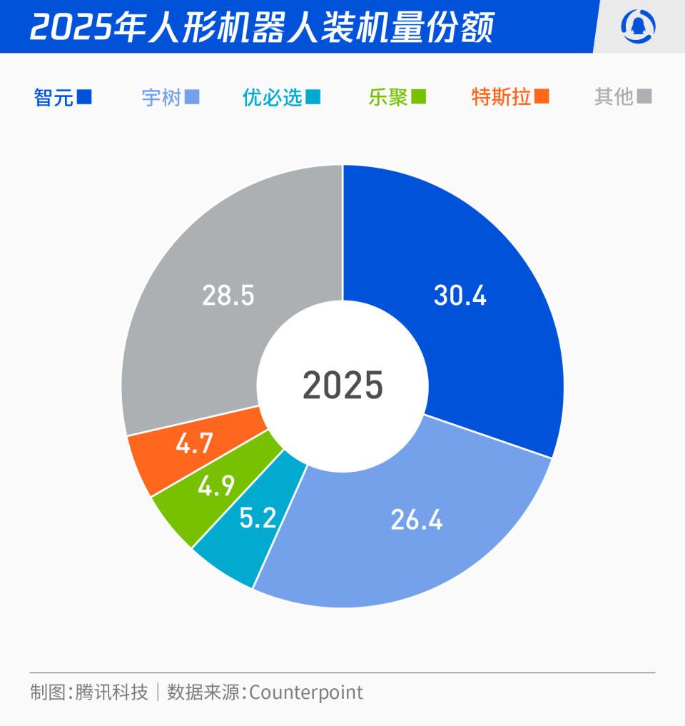 另外,市场机构 Counterpoint 日前披露的数据也显示,智元、宇树和优必选三家企业占据人形机器人市场份额前三名,分别为 30.4%、26.4%、5.2%。