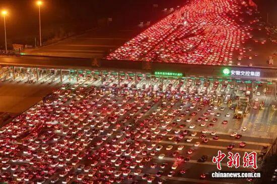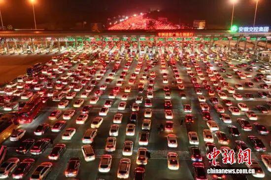 2 月 22 日,正月初六,春节假期进入尾声,全国迎来返程客流高峰。位于安徽省全椒县、毗邻皖苏两省交界的吴庄收费站,迎来密集返程车流。该收费站双向共设有 36 个车道,是目前国内车道数量最多的高速公路收费站。图为在吴庄收费站,车辆有序通行。