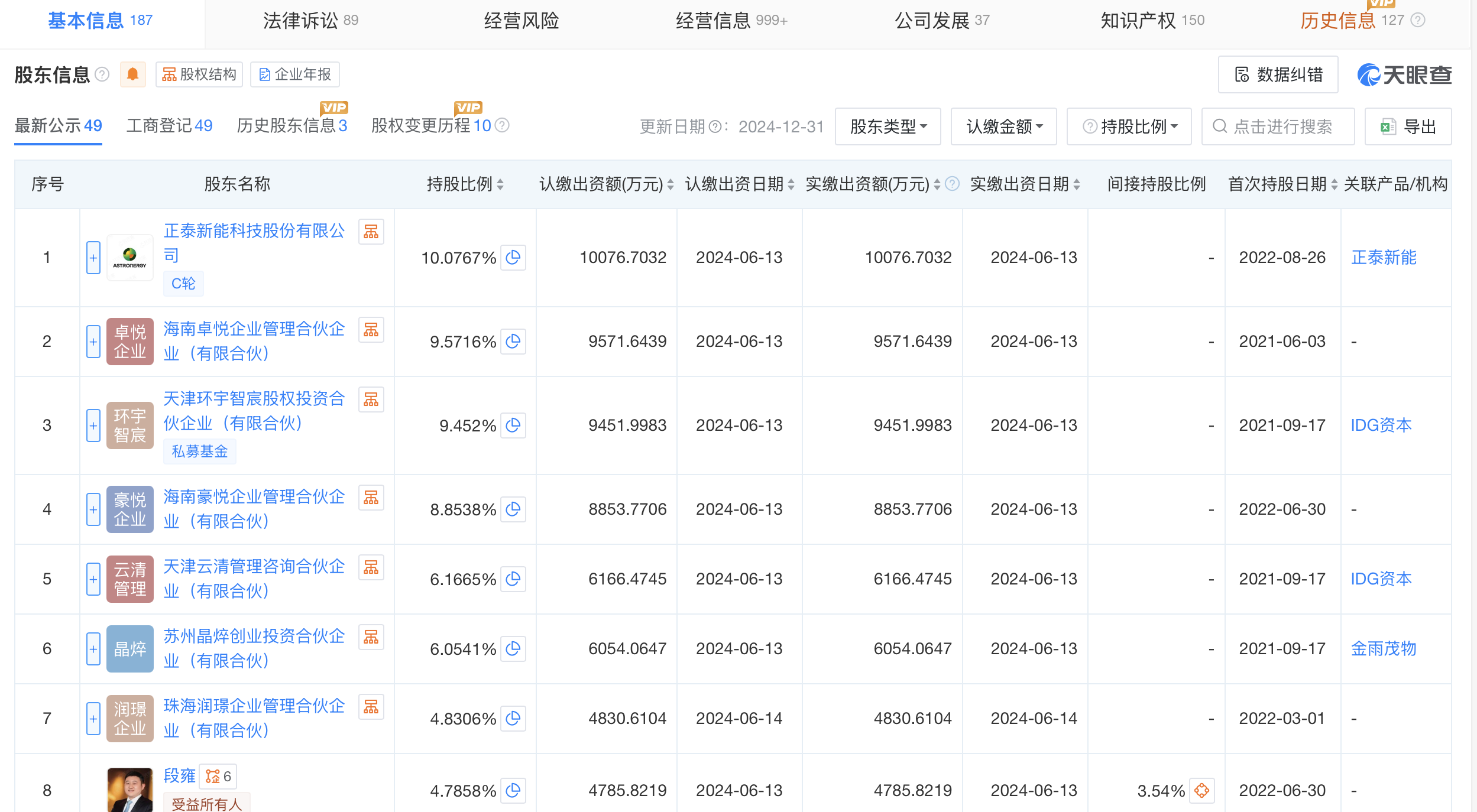 目前,天眼查APP显示,青海丽豪最大的股东是正泰新能,其持股比例约10.077%;段雍直接持股比例约4.79%,其同样通过海南豪悦等主体间接对青海丽豪持股。