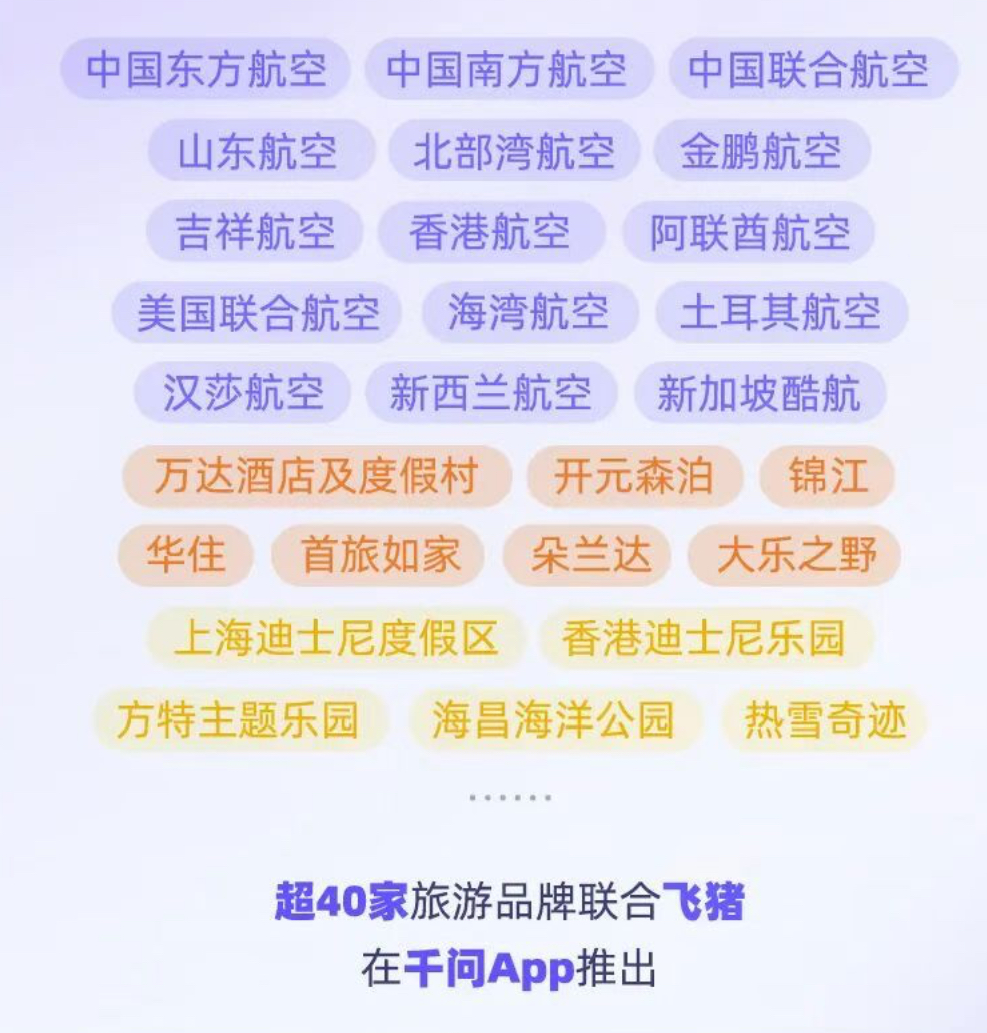 首批合作名单包括中国东方航空、中国南方航空、中国联合航空,以及万达酒店及度假村、锦江、华住、首旅如家等企业,并向用户推出专属“千问价”。