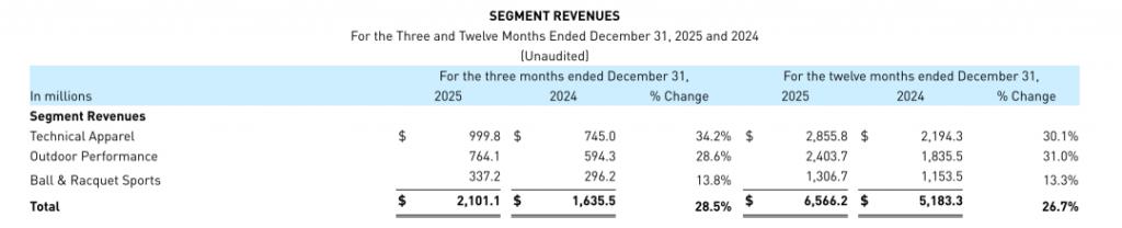 报告期内,技术服装、户外运动、球类与球拍运动三大业务板块均实现大幅增长。值得注意的是,始祖鸟所在的技术服装板块 2025 年第四季度业绩增长 34% 达近 10 亿美元。