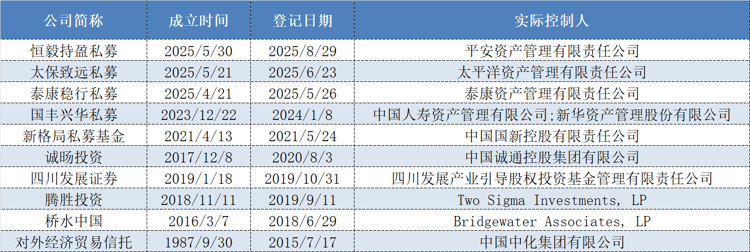 其中,有4家为险资系私募,分别是平安资产旗下的恒毅持盈私募、太平洋资产旗下的太保致远私募、泰康资产旗下的泰康稳行私募以及中国人寿资产与新华资产共同控制的国丰兴华私募;2家为外商独资控股的私募,分别是桥水中国和Two Sigma旗下的腾胜投资;还有4家分别是中国中化集团旗下的对外经济贸易信托、中国国新控股旗下的新格局私募、中国诚通控股集团旗下的诚旸投资、四川发展产业引导股权投资基金旗下的四川发展证券等。