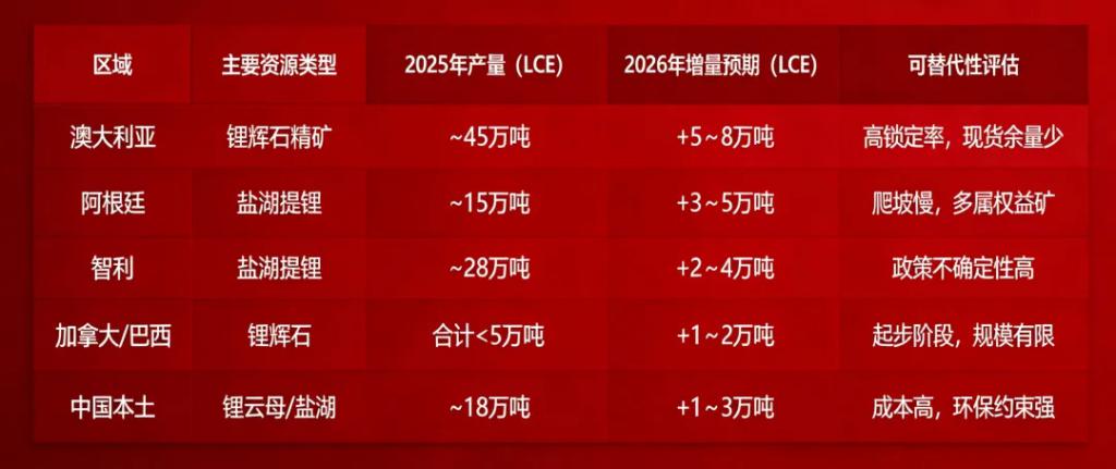 从短期替代来源看,澳大利亚作为全球最大锂供应国,2026 年预计新增产能约 5 到 8 万吨碳酸锂当量。但问题在于,澳矿产能已被长协锁定,现货市场余量有限,且海运周期较长。