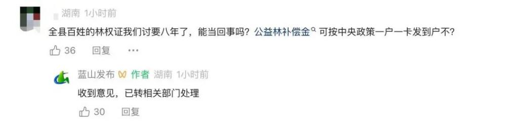 目前,该条视频下边,有多位当地网友反馈问题," 蓝山发布 " 回应 " 收到意见,已转相关部门处理。"