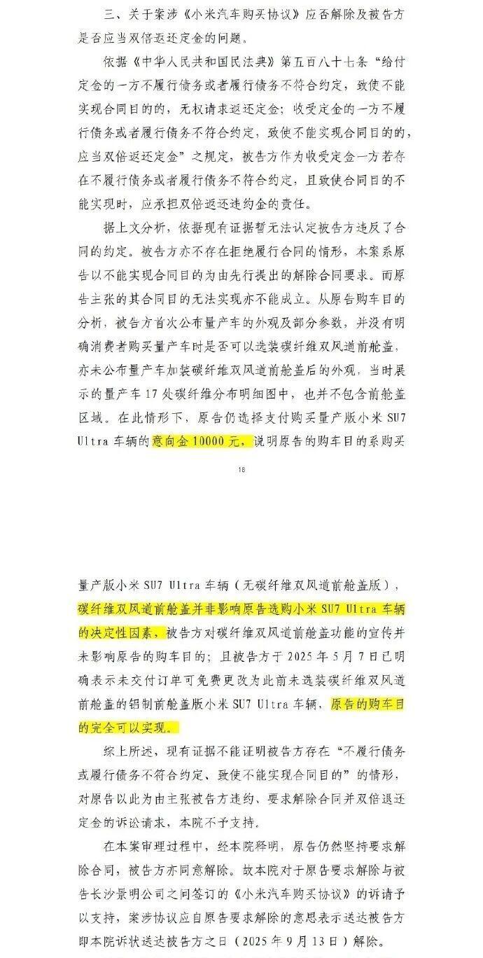 关于案涉《小米汽车购车协议》应否解除及被告方是否应当双倍返还定金的问题。法院认为,现有证据无法证明被告存在违约或拒绝履行合同的情形。原告在被告尚未公布量产车是否可选装碳纤维双风道前舱盖的情况下,便支付了 1 万元意向金,说明其购车目的主要是购买量产版小米 SU7 Ultra,碳纤维双风道前舱盖并非决定性因素。后续被告明确表示未交付订单可免费更换为普通版车型,原告的购车目的可以实现。