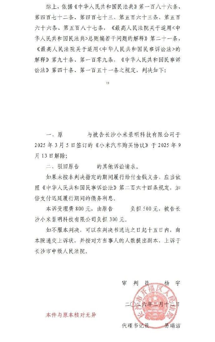 近日,长沙市开福区人民法院就用户起诉小米汽车 " 挖孔机盖事件 " 作出一审判决。判决日期为 2026 年 2 月 12 日,法院认定被告长沙小米景明科技有限公司不构成虚假宣传或销售欺诈,亦不存在违约行为。据此,法院判决双方于 2025 年 3 月 15 日签订的购车协议于 2025 年 9 月 13 日解除,并驳回了原告要求双倍返还定金等诉讼请求。
