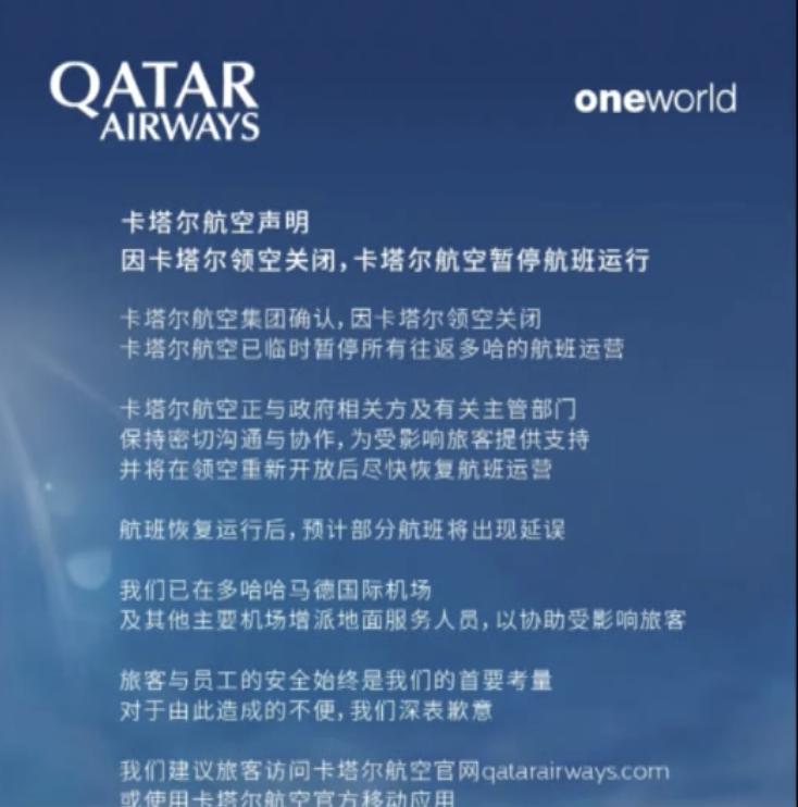 随着局势恶化,2 月 28 日,以色列机场管理局称,已关闭以色列领空对民用航班的开放,呼吁公众不要前往以色列机场。卡塔尔、阿联酋等多个国家领空随后也依次宣布关闭领空或部分领空,航班取消。卡塔尔航空发布公告称,因卡塔尔领空关闭,卡塔尔航空暂停航班运行。