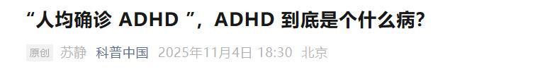 据科普中国,ADHD,全称 " 注意缺陷 - 多动障碍 "(Attention Deficit Hyperactivity Disorder),是一种神经发育障碍,也就是我们常说的 " 多动症 "。顾名思义,ADHD 既可能表现为 " 注意力缺陷 ",也可能表现为 " 多动 " 和 " 冲动 "。