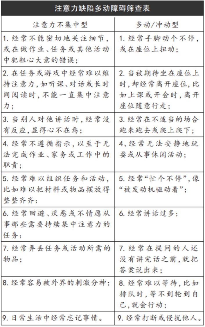 下表可帮助初筛多动症,可以对照测验。如果在两类指标中,有 6 条或 6 条以上症状时,就要警惕。