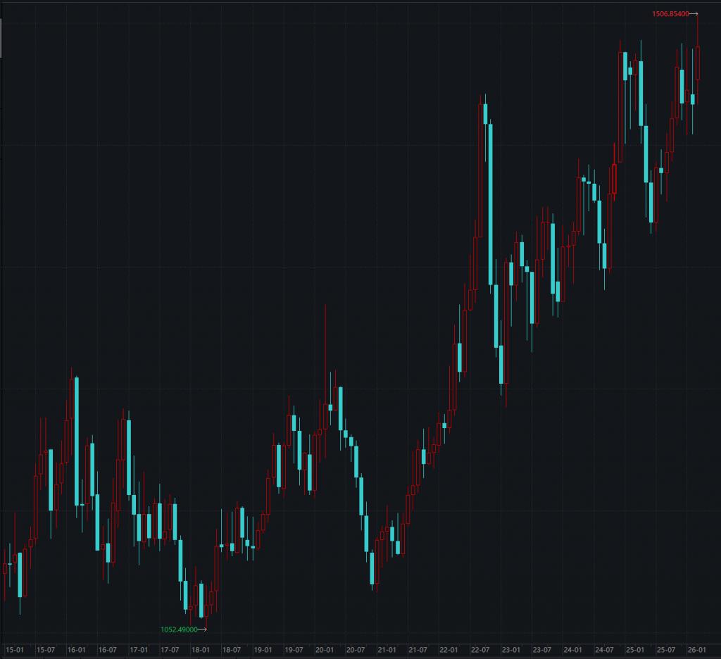 美元对韩元月 K 线走势图(2015 年 1 月 ~2026 年 3 月)