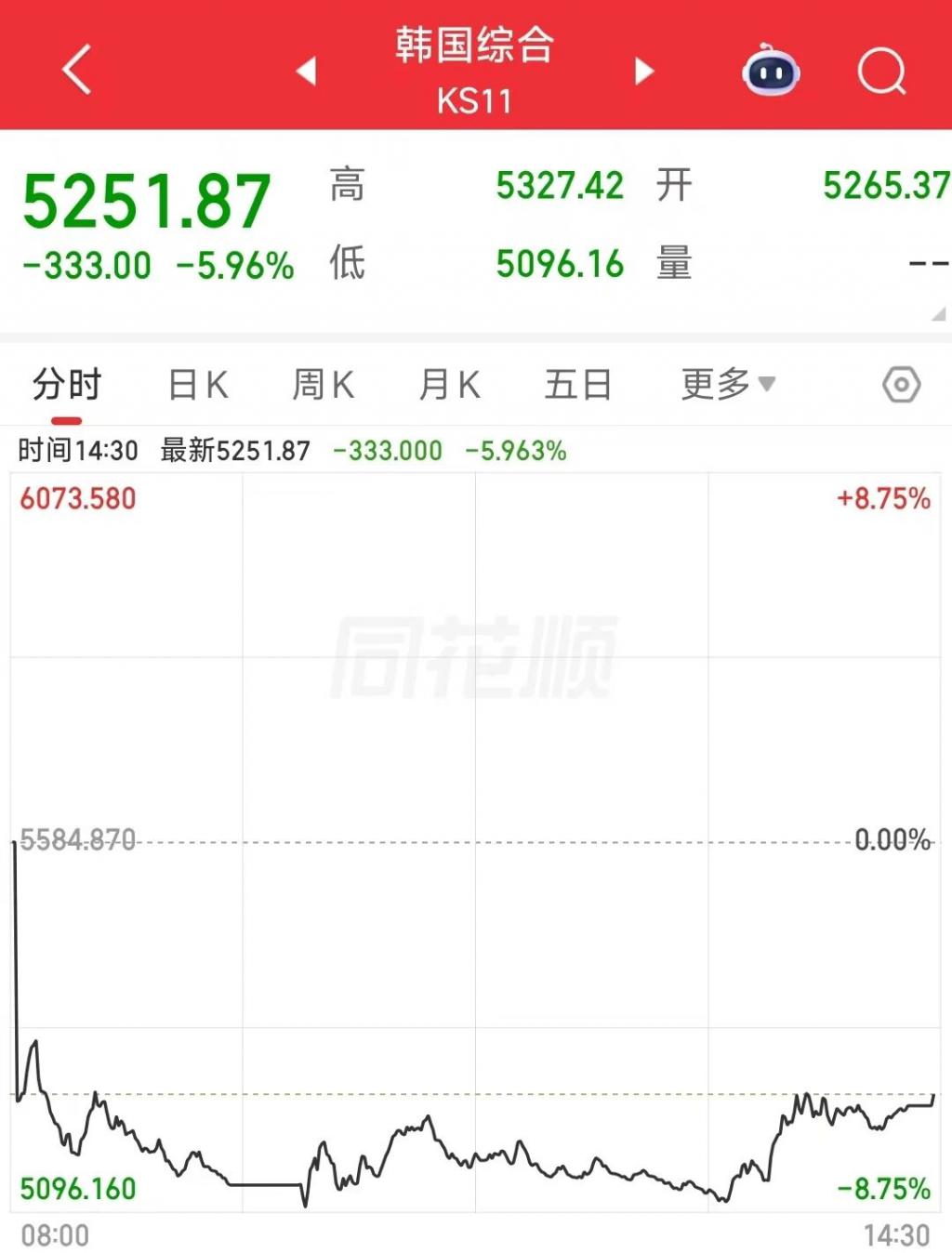 韩国股市今日大跌。韩国综合股价指数(KOSPI)盘中触发 " 临时停牌 " 机制。截至收盘,跌 5.96%,报 5251.87 点。
