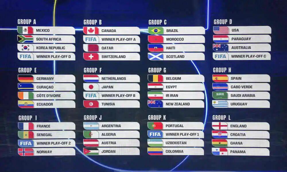 △ 2025 年 12 月 5 日拍摄的 2026 美加墨世界杯小组赛抽签仪式上,现场大屏幕显示的抽签结果。