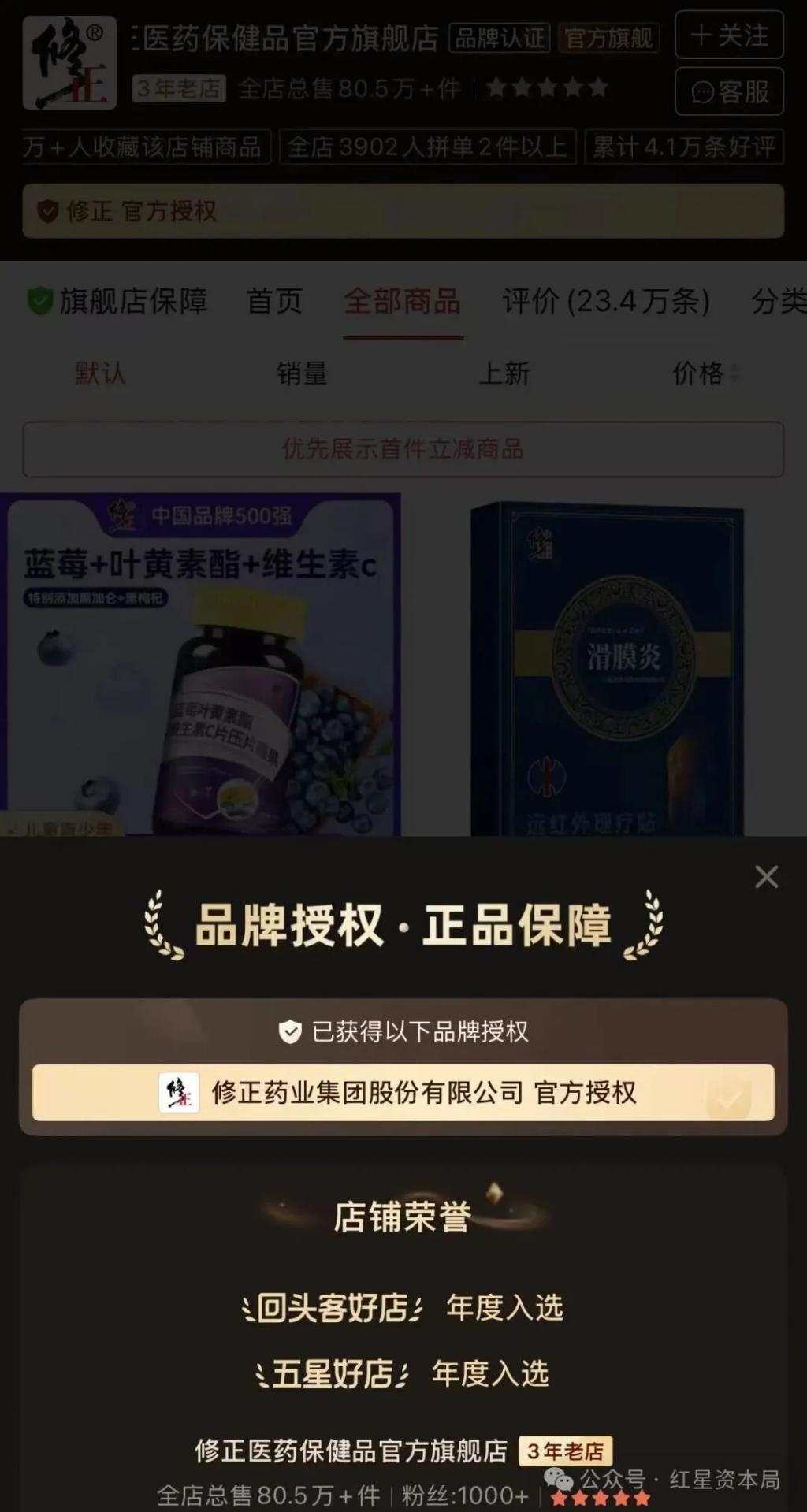 在电商平台,印有 " 修正 " 商标的产品比比皆是,除了各类常用药,还有保健品、日用品等。不过,红星资本局近日调查发现,一些标注为 " 修正 " 品牌的产品,实际生产厂家与修正药业无关。此外,电商平台上部分销售这些产品的店铺,却能出具修正药业的授权书。