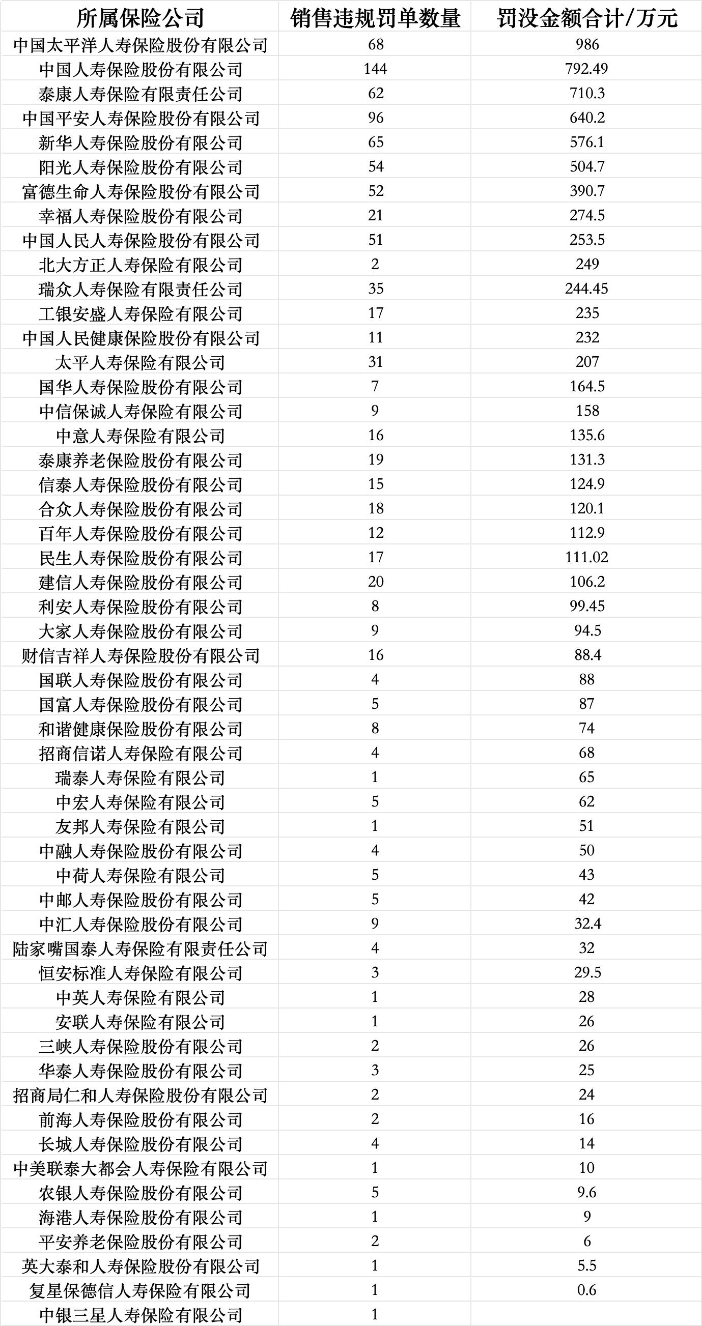 寿险方面,2025年,中国太平洋人寿保险股份有限公司因销售行为违规所获罚金最多,合计达到986万元,其次为中国人寿保险股份有限公司,近800万元。