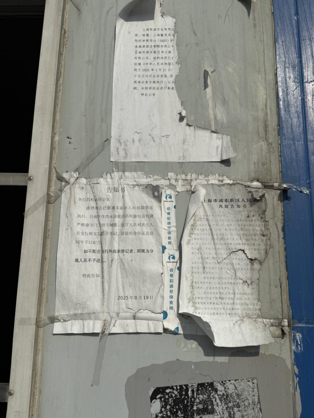 ●浦津酒店大门张贴的通知。李晓芳 摄