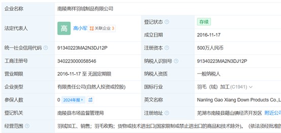 其中,南陵安明羽绒有限公司(下称“安明羽绒”)成立于2017年,注册资本500万元、实缴资本500万元,参保人数持续为零,主要人员3人。