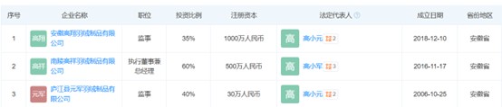 比“零人供应商”更值得警惕的,是关联供应商的“精准切换”。2021至2022年,南陵高祥羽绒制品有限公司(下称“高祥羽绒”)是古麒绒材第五大供应商,累计采购额约2800万元。2023年,高祥羽绒退出供应商名录,由同一自然人高小军控股的安徽高翔羽绒制品有限公司(下称“高翔羽绒”)接替,当年采购额增至7000万元,跃升为古麒绒材第一大供应商。