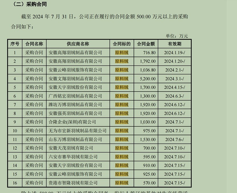 招股书显示,2024年上半年,安明羽绒还是古麒的第二大供应商(采购额3600万),但在截至2024年7月31日高于500万元的采购合同中,却看不到这家公司的身影。取而代之的供应商大都位于无为市周边甚至外省,古麒绒材所在的南陵县已经没有一家大型供应商。