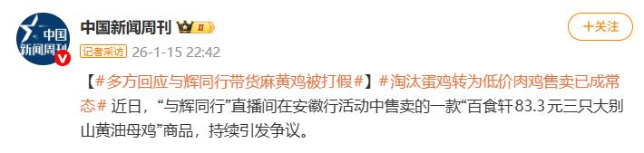 更早的还有去年底的 " 皖西麻黄鸡 " 事件。与辉同行卖 83.3 元 3 只的鸡,直播间说 " 山林散养 180 天 ",结果当地产业协会直接打脸:正宗皖西麻黄鸡,单只养殖成本就超过 150 块,你们卖的不正宗。