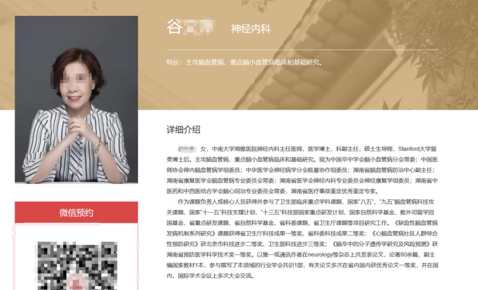 公开资料显示,谷某某现年 58 岁,是湘雅医院神经内科主任医师、医学博士、科室副主任及硕士生导师,曾在美国斯坦福大学从事博士后研究,主要研究方向为脑血管病。其同时担任中国卒中学会脑小血管病分会常委、湖南省脑血管病防治中心副主任等多项学术职务,并多次参与国家级科研项目。