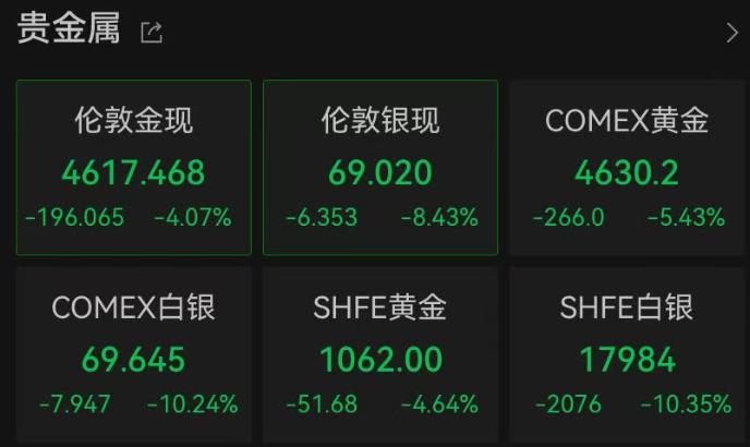 首页 > 资讯 黄金、白银大跳水!白银期货“崩盘”,跌超10% 记者 | 杜宇编辑 | 何小桃 杜恒峰 校对 | 段炼3 月 19 日晚间,黄金、白银价格大跳水。截至发稿,现货黄金日内跌幅扩大至 4.07%,报 4617.46 美元 / 盎司。现货白银日内跌幅扩大至 8.43%,报 69.02 美元 / 盎司。白银期货 " 崩盘 ",COMEX 白银期货跌超 10%,现报 69.65 美元 / 盎司。(免责声明:本文内容与数据仅供参考,不构成投资建议,使用前请核实。据此操作,风险自担。)