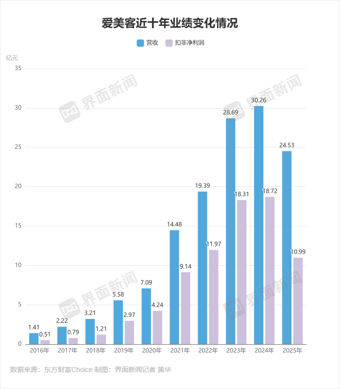 过去,爱美客的增长有目共睹。近十年间,其营收从破亿涨至超30亿元,净利润从大几千万增至近20亿元。在上市后初期,也就是2021年至2023年间,该公司营利的最低增速也在30%之上。