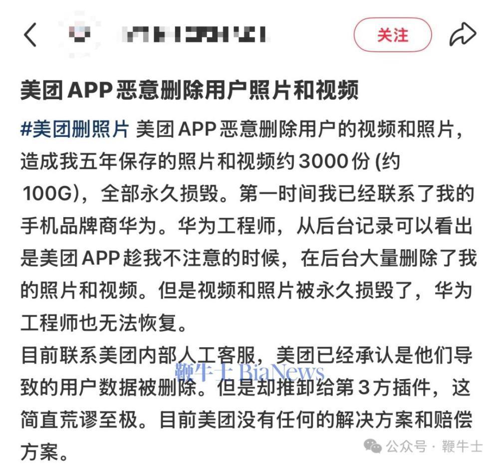 同时,有网友称,自己的手机曾被美团一次性删除上千张照片与视频。