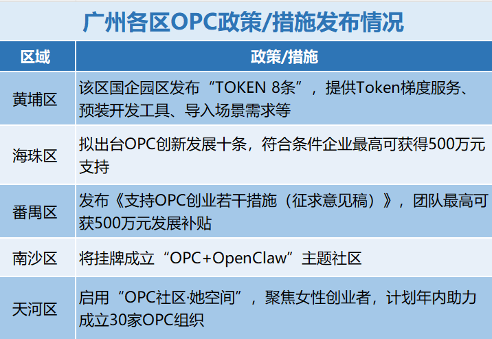 这场细化到区县级的竞赛中,据界面新闻梳理,在广州,目前已有黄埔区、海珠区、番禺区等几个区预告了相关政策:海珠区宣布即将出台OPC创新发展十条,黄埔区由国企园区发布了“TOKEN 8条”,番禺区发布了《广州市番禺区支持OPC创业若干措施(征求意见稿)》。