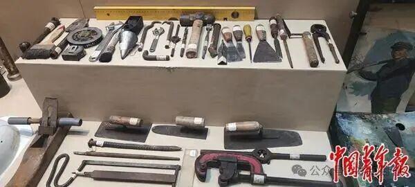 " 工地 " 旁的展柜里,陈列着他们工作用的安全帽、钳子、楔子、铲子,还有消遣时会打开的深绿色电唱机。一个名为何林的基建工程兵从重庆来,他捐出了老兵送他的有 " 红岩 " 字样的日记本。一位名为杜泰荣的基建工程兵捐出了自己的画箱。
