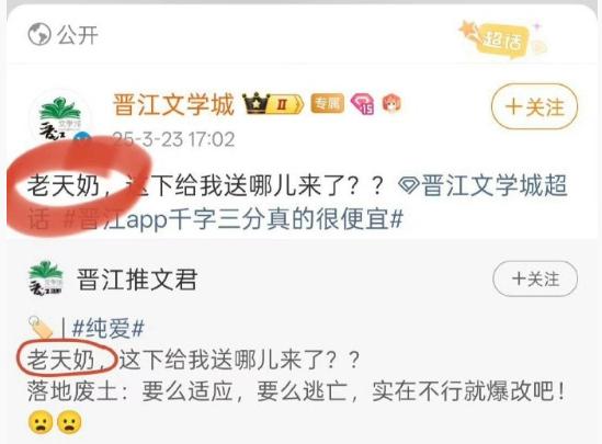 然而,这份说明中关于内容审核的具体标准,却引发了更大的争议。说明中明确 " 严禁使用非经汉语权威机构承认的生造字词或短语 ",并举例 " 老天奶(为网络通用口语,类似‘老天爷’的变体)"。但有用户发现,晋江官方账号此前曾使用 " 老天奶 " 一词进行内容宣传。在被用户质疑后,相关博文已被删除。