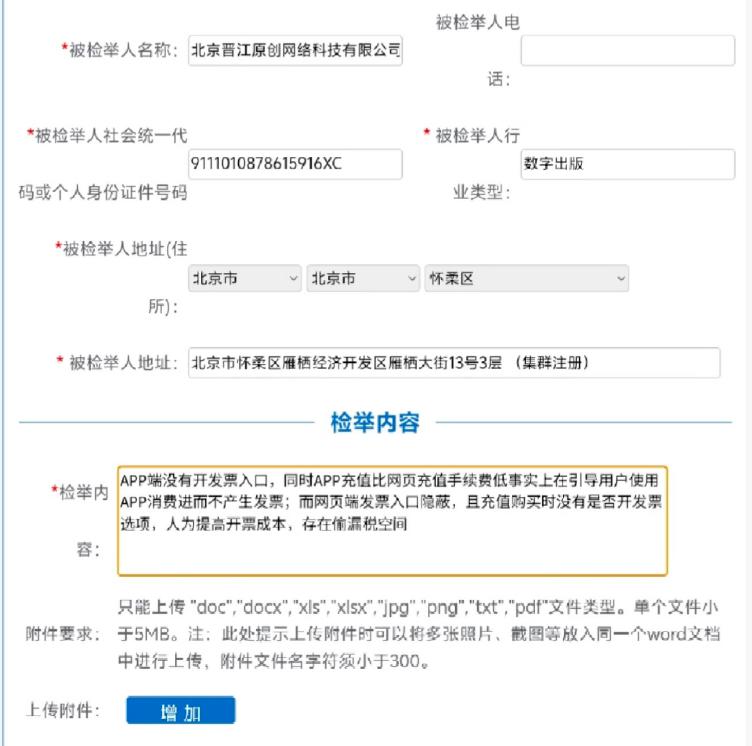 还有用户指出,在晋江的 APP 客户端并无直接申请发票的选项,用户必须通过网页端,经历 " 登录→财务→余额→开发票 " 四级菜单才能找到入口,操作极为繁琐。有用户认为此举可能构成 " 少列收入 ",存在偷逃增值税及企业所得税的嫌疑,向税务部门投诉北京晋江原创网络科技有限公司,要求核查其是否存在偷漏税行为。
