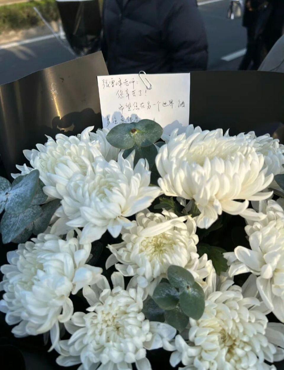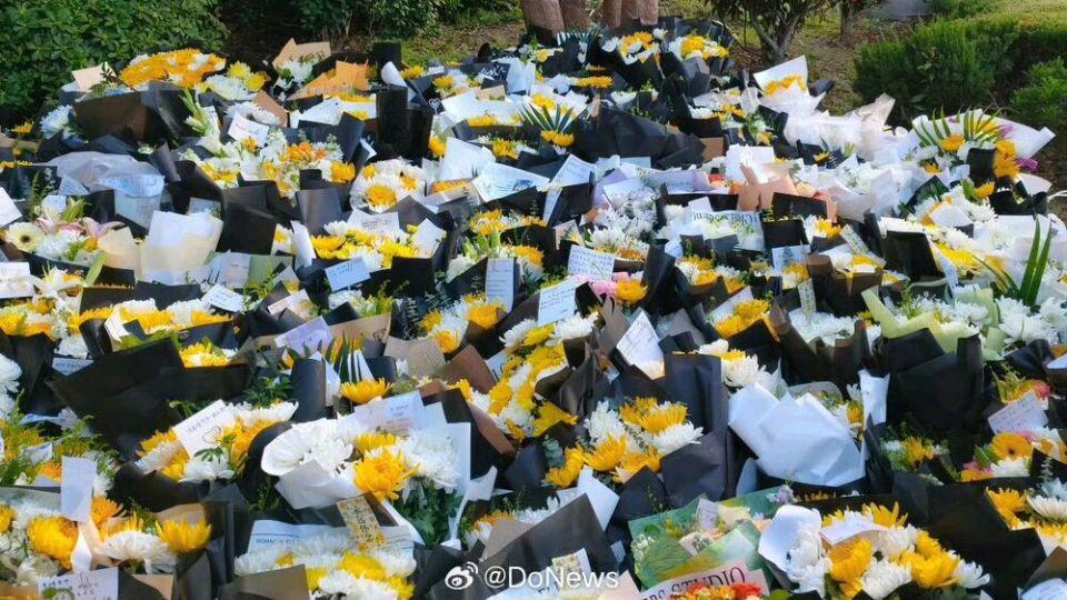 峰学蔚来公司楼下,被鲜花淹没,卡片上写满了 " 张老师,休息吧 "。