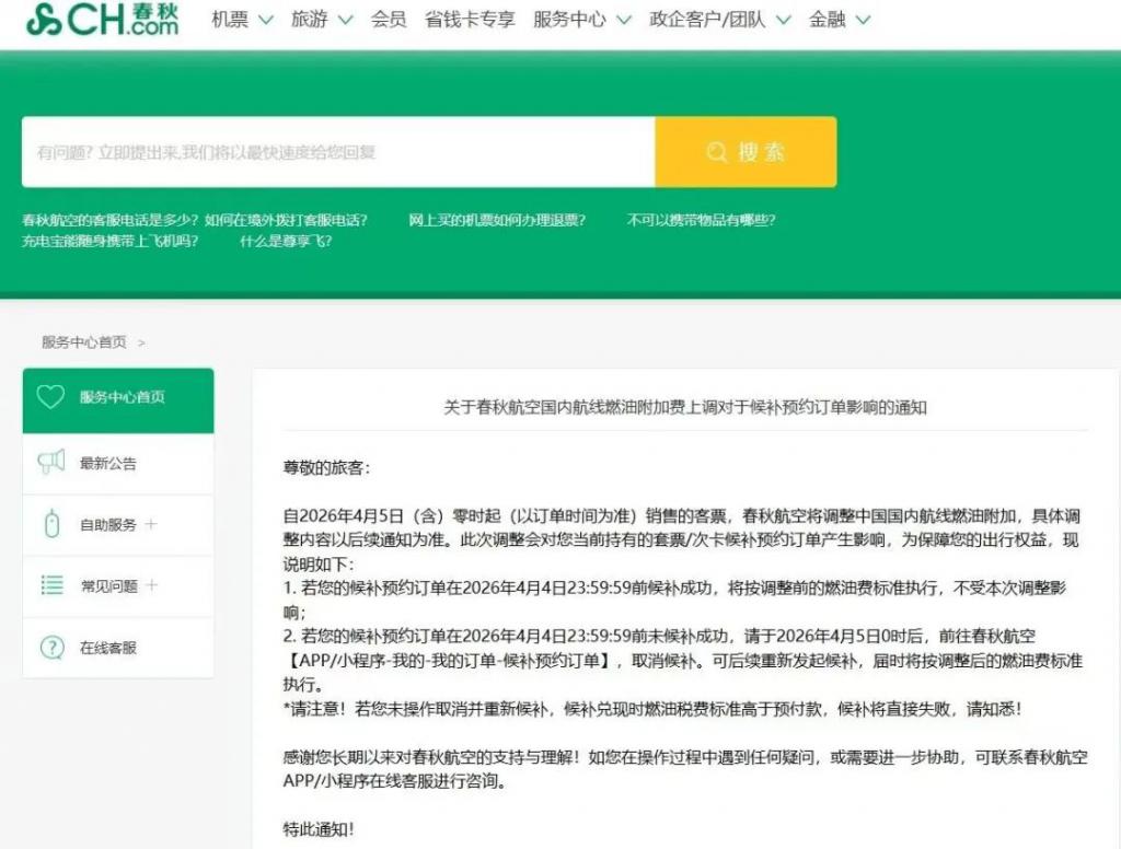 包括春秋航空在内的多家航空公司发布了上调航线燃油附加费的通知