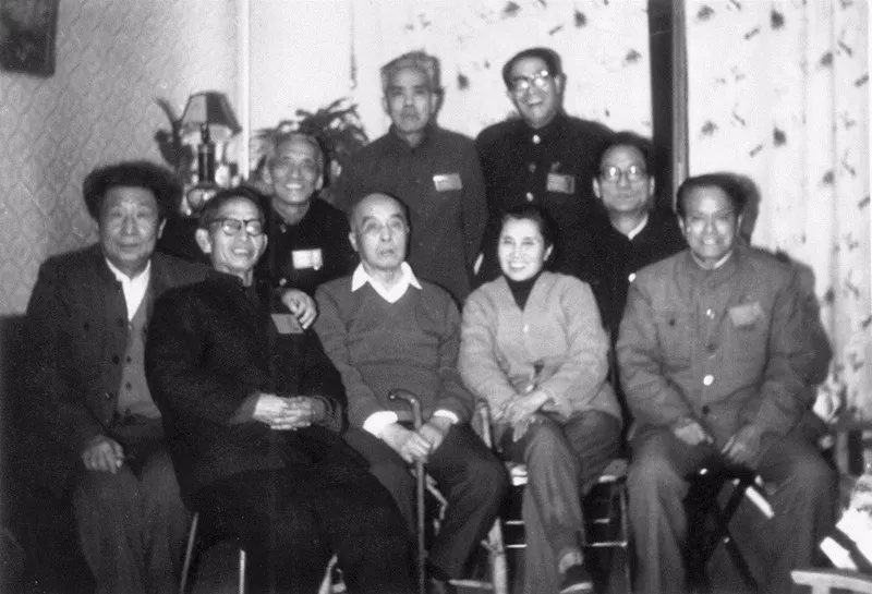 1984年底参加作代会的朋友们与胡风梅志夫妇合影,前排左起:徐放、贾植芳、胡风、梅志、冀汸;后排左起:曾卓、路翎、绿原、牛汉
