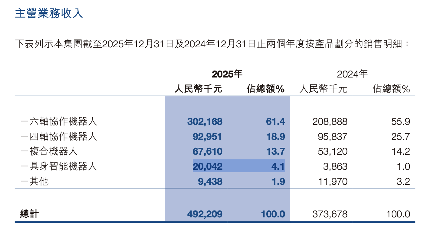 越疆科技主营协作机器人。该公司称,去年营收增长主要得益于协作机器人市场渗透率与市场份额提升,以及具身智能产品的快速增长。其中,六轴协作机器人销售额实现44.7%的大幅增长,占营业收入超六成。