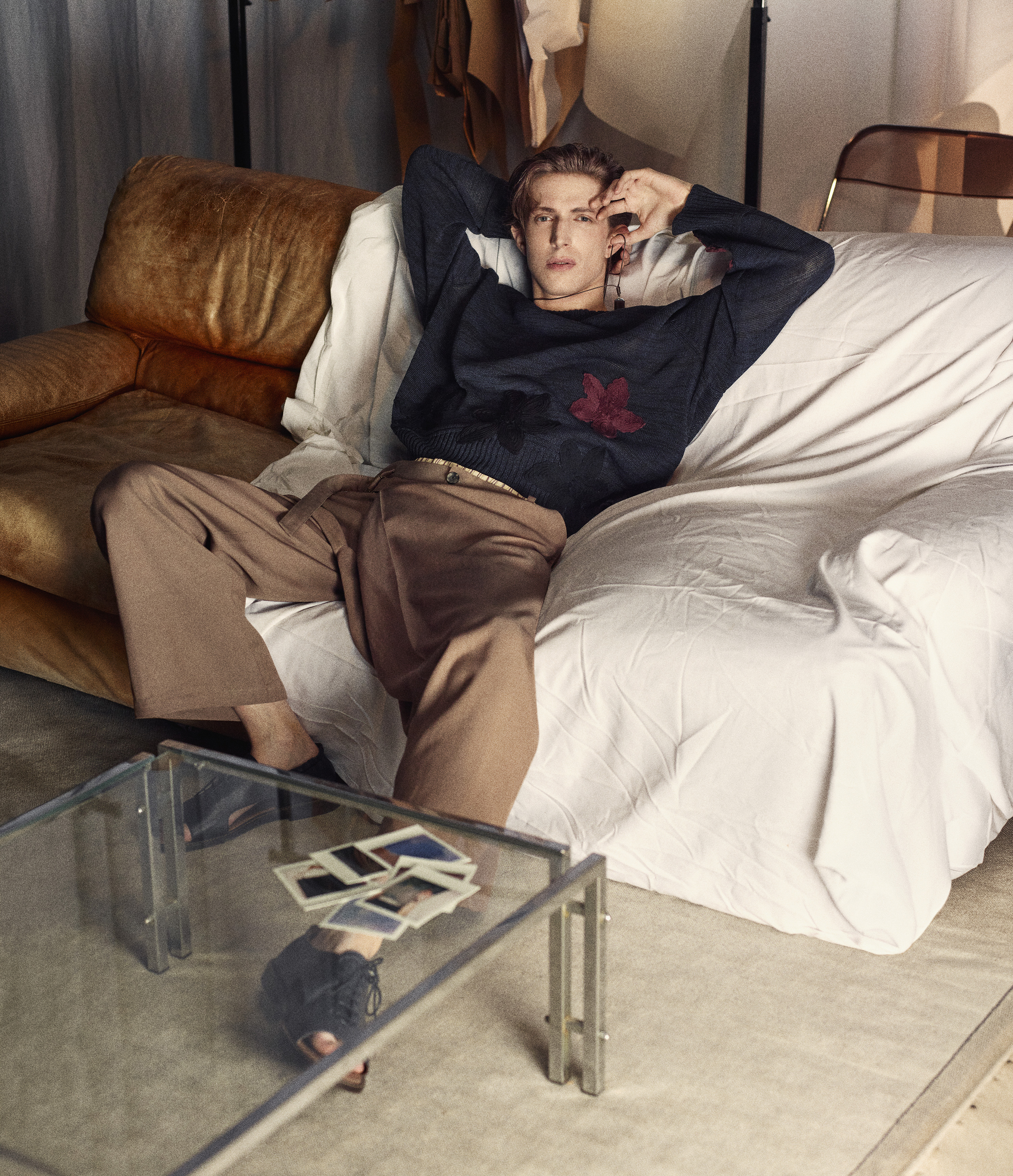 Zara Studio 男装系列诠释随性多元的现代男性气质,灵感源自旅行与自我穿搭态度。多褶阔腿低腰裤,搭配宽松条纹古巴领衬衫、钩花针织上衣与轻薄衬衫。柔软腰带休闲剪裁西装内搭纱质衬衫,刺绣夹克搭配宽松长裤,细条纹西装以抽绳收腰,共同打造利落廓形。