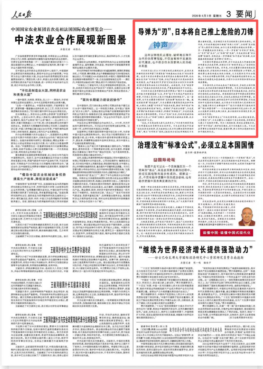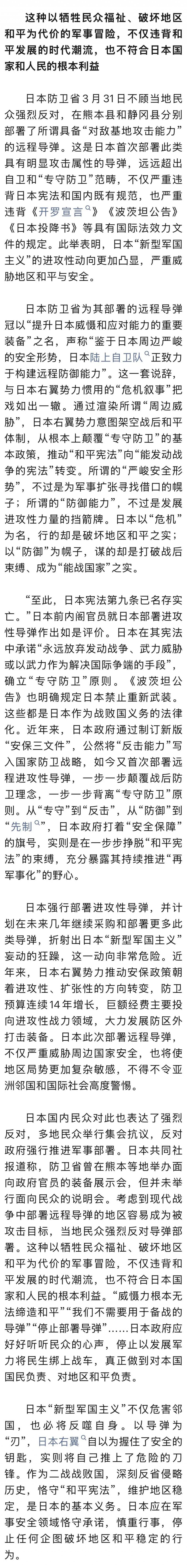 首页 > 资讯 人民日报钟声:日本强行部署进攻性导弹,折射出日本“新型军国主义”妄动的狂躁 4 月 3 日,《人民日报》03 版 " 钟声 " 发表评论文章《导弹为 " 刃 ",日本将自己推上危险的刀锋》。全文如下:编辑 | 金冥羽 向江林校对 | 张锦河本文转载自人民日报