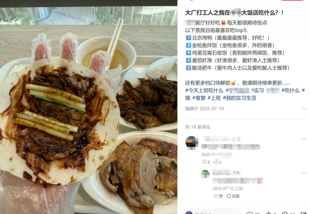 有个大厂很独特,进去的实习生、刚入职的、入职多年的员工,都会在某书上 " 炫耀 " 食堂餐食之丰盛可口,以此来作为一个大厂员工社交账号的特有标签,及起号的第一步。