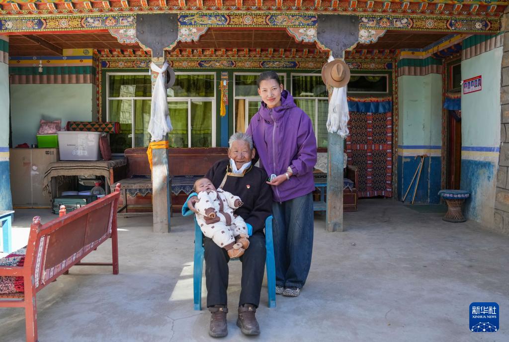 次仁桑珠(中)和孙女、曾孙在西藏山南市扎囊县桑耶镇家中的合影(3 月 25 日摄)。