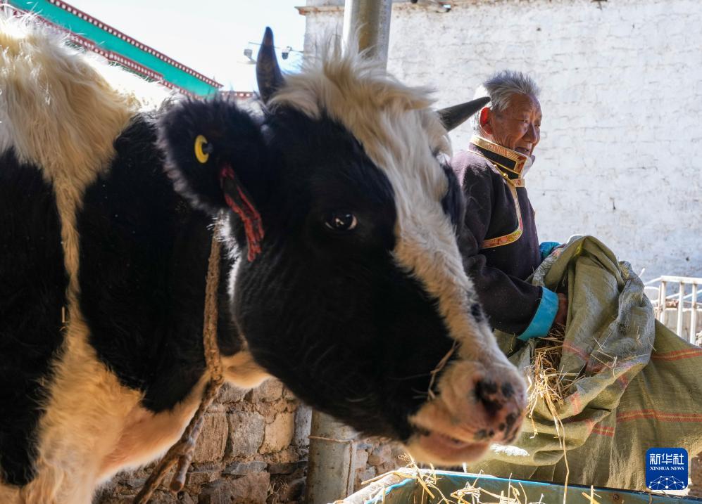 次仁桑珠在西藏山南市扎囊县桑耶镇的家中喂牛(3 月 25 日摄)。