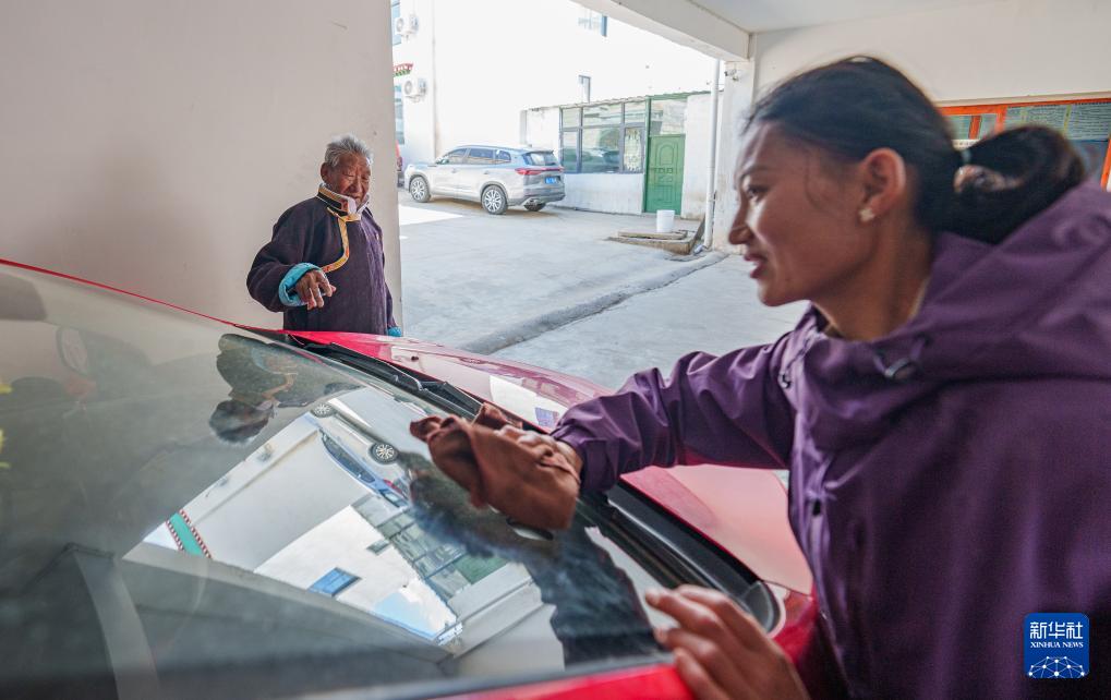 次仁桑珠(左)在西藏山南市扎囊县桑耶镇的家中和孙女一起擦车(3 月 25 日摄)。