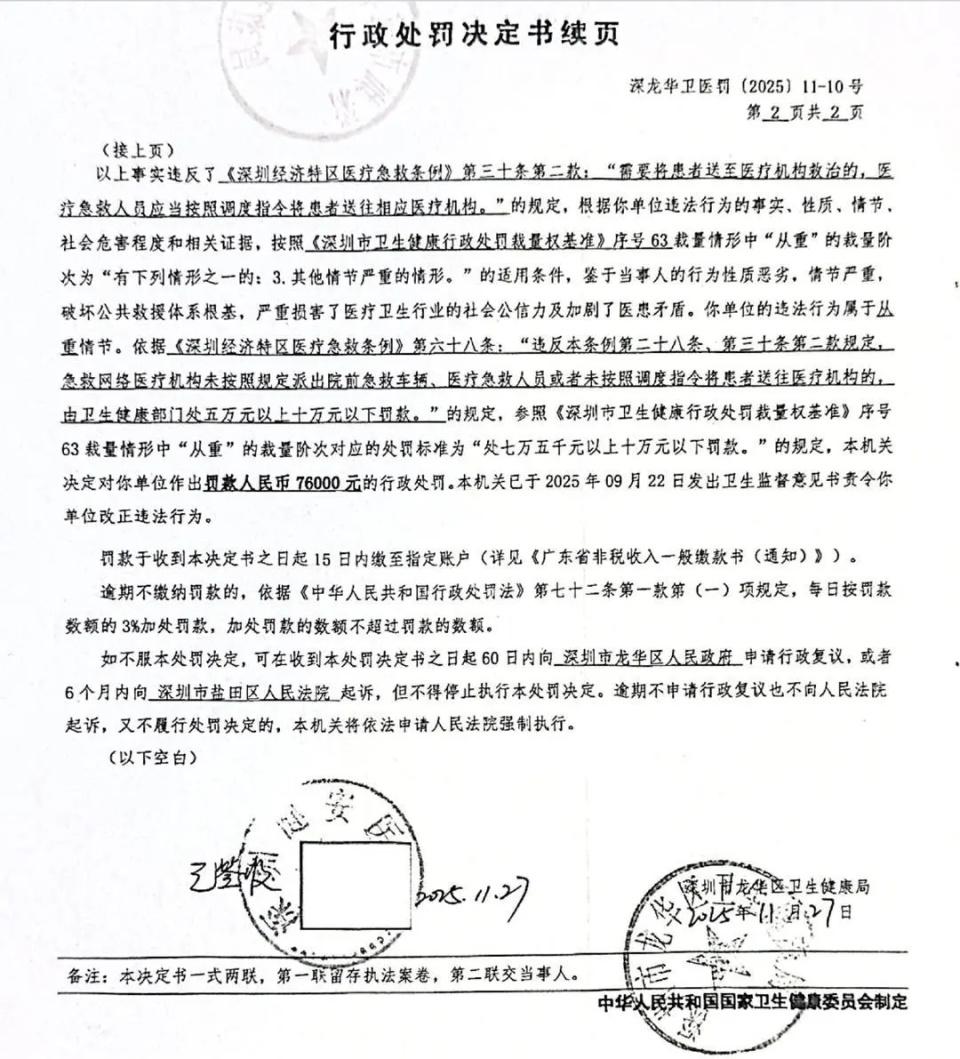 事发三个多月后,涉事深圳健安医院因违反深圳市医疗急救相关条例受到行政处罚。据信用中国网站公示信息,深圳市龙华区卫生健康局于 2025 年 11 月 27 日发布行政处罚决定书,经查实," 深圳健安医院在 2025 年 8 月 5 日转运患者张某某时,未按医疗急救调度指令将患者转运至指定的龙华区人民医院救治。"