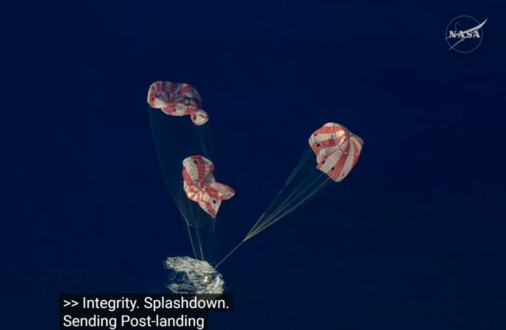搭载 4 名宇航员的 " 猎户座 " 飞船抛掉承载主火箭系统的服务舱,以约 32 倍音速冲入大气层,飞船外部温度飙升至高达 2760 摄氏度。飞船还经历约 6 分钟的无线电通信中断、也就是 " 黑障 "。溅落太平洋前,降落伞从自由落体的飞船头部展开,将其下降时速减缓至约 27 公里。
