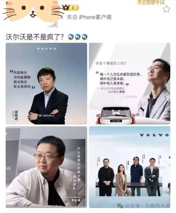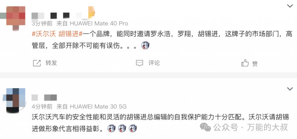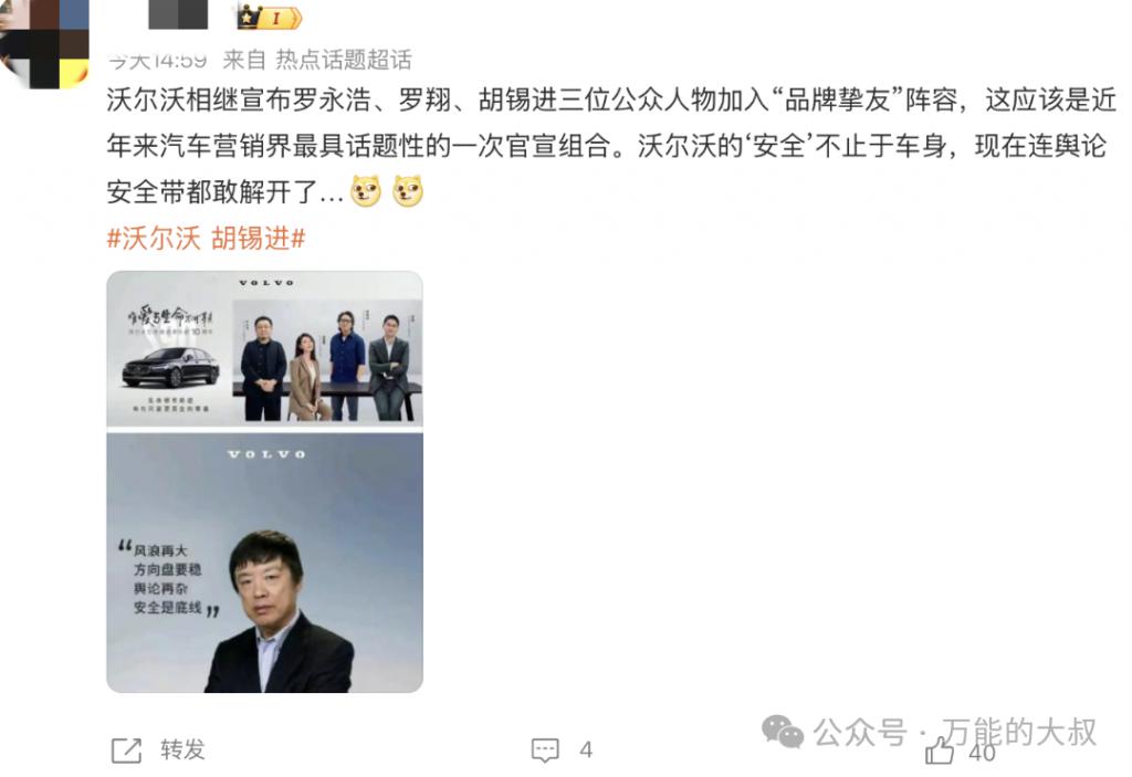 " 继罗翔、罗永浩之后,沃尔沃又选中了胡锡进,不知道该说什么好,沃尔沃公关部门绝对有 " 高人 ",中国舆论场三大顶流 KOL,居然同属一个汽车品牌,沃尔沃再次把 " 安全 " 的品牌溢价,传递给广大网友。" 某微博网友。