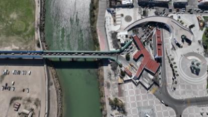 2025 年 2 月 16 日,在美墨边境墨西哥科阿韦拉州彼德拉斯内格拉斯市,车辆在一座国际桥上行驶,画面右侧为墨西哥(无人机照片) 图:新华社