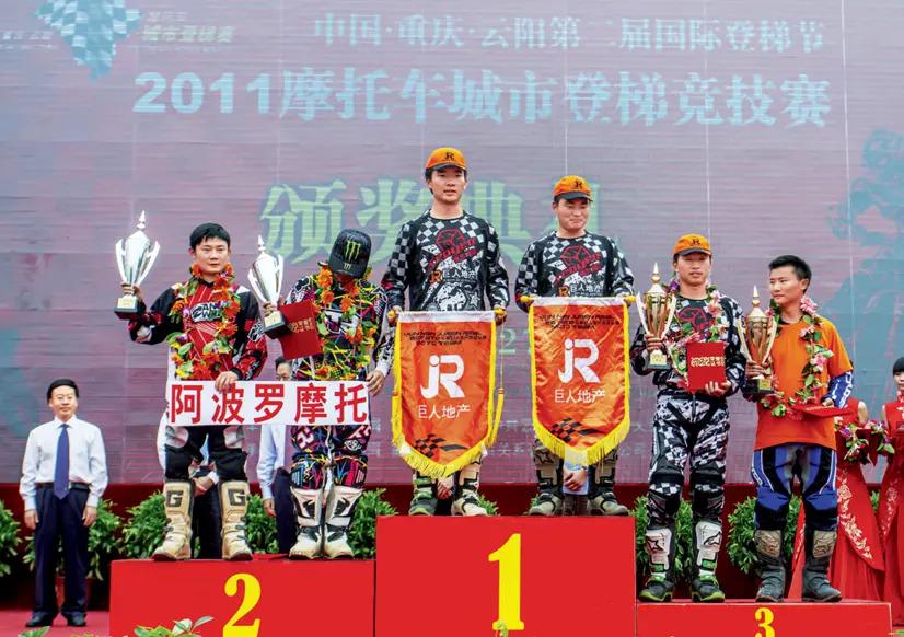 · 2011 年 9 月 27 日,张雪(前排左一)参加重庆云阳摩托车城市登梯竞技赛,并代表阿波罗摩托获得第二名。(视觉中国)