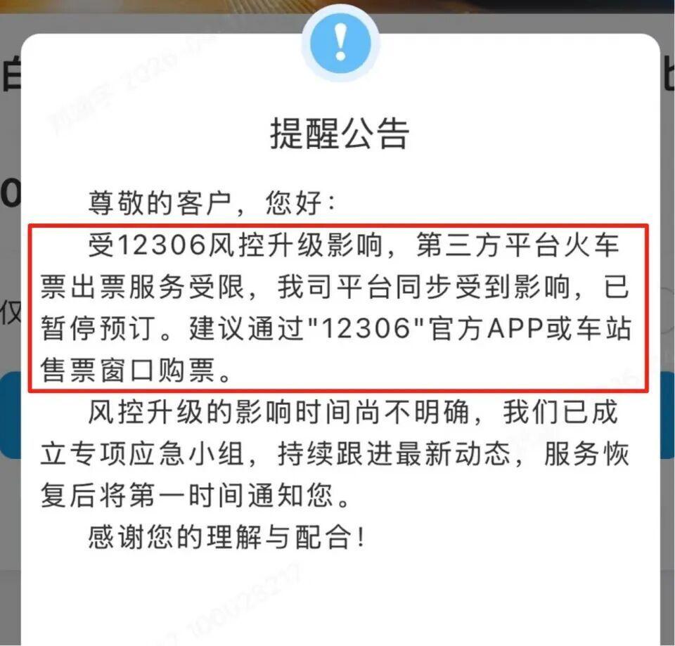 网友称多个商旅平台订购火车票功能受限,客服:受12306风控升级影响