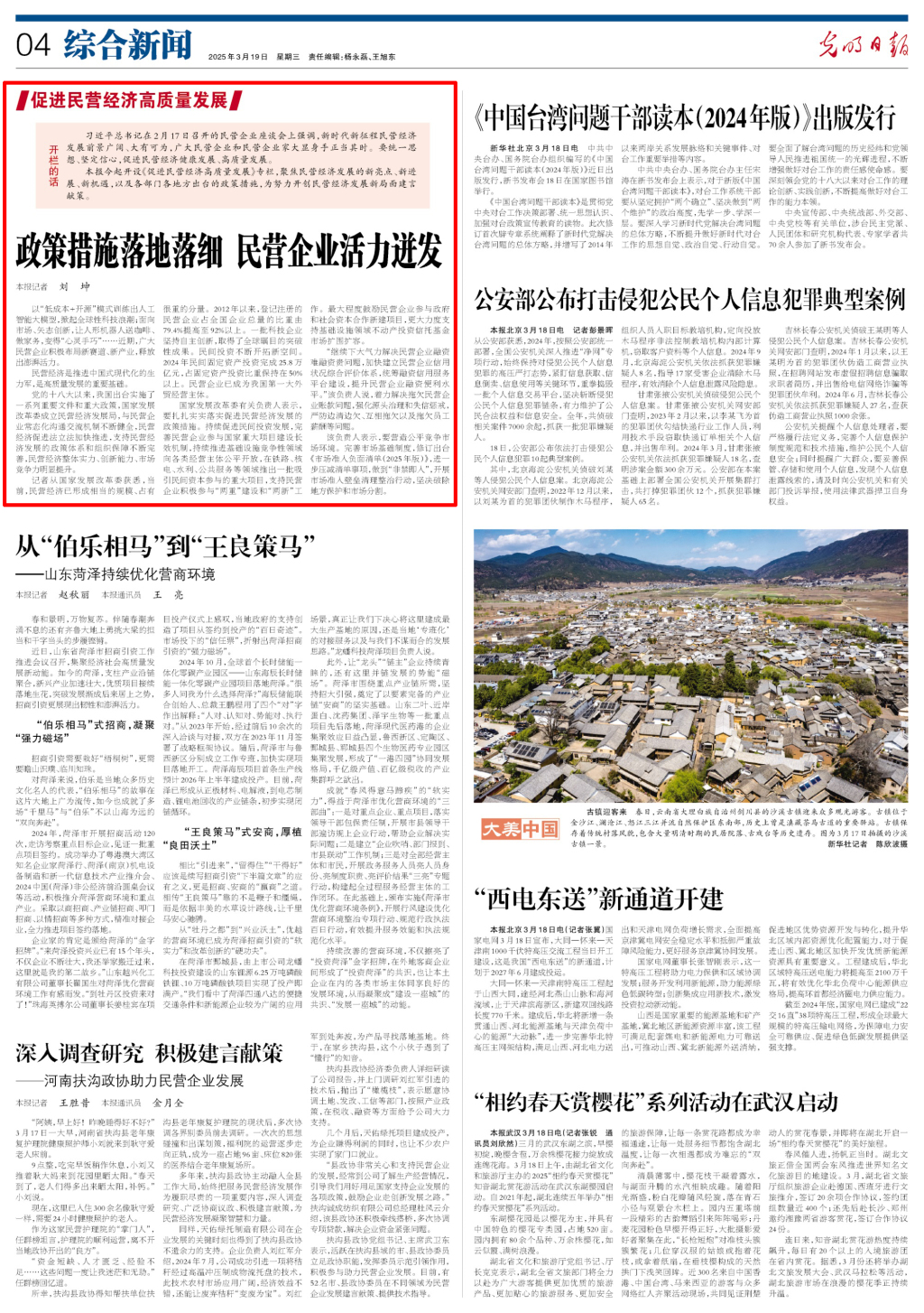 《人民日报》《新华每日电讯》《光明日报》等主要央媒同日开启专栏“促进民营经济高质量发展”,讲述新时代新征程民营经济健康发展、高质量发展的故事,激励广大民营企业和民营企业家胸怀报国志、一心谋发展、守法善经营、先富促共富,为推进中国式现代化作出新的更大贡献。