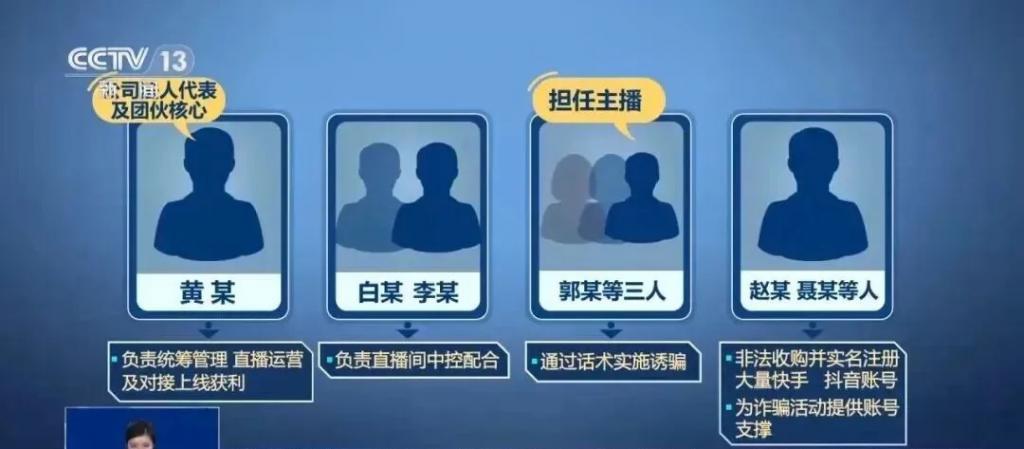经查,这个团伙分工明确,黄某作为公司法人代表及团伙核心,负责统筹管理、直播运营及对接上线获利;白某、李某负责直播间中控配合;郭某等三人担任主播,通过话术实施诱骗;赵某、聂某等人非法收购并实名注册大量快手、抖音账号,为诈骗活动提供账号支撑。